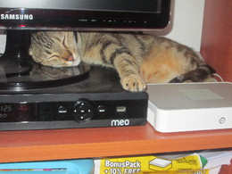 Sim, ouviram bem! Como podem ver, a nossa gata costuma dormir no móvel onde está a televisão, em cima do router (porque está quentinho). Passa ali várias horas quando vê que estamos ocupados e não nos podemos sentar para que ela vá para o nosso colo.