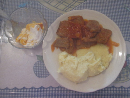 Carne assada com puré de batata, e gelado de manga para sobremesa!