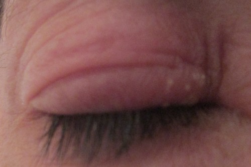 Quinta-feira acordei com uma borbulha pequena no interior da pálpebra. Na sexta, essa borbulha desapareceu, mas apareceram outras no exterior. Para além do prurido e dor, tinha a pálpebra inchada, o olho lacrimejante, sensibilidade à luz e ligeira diminuição da visão.